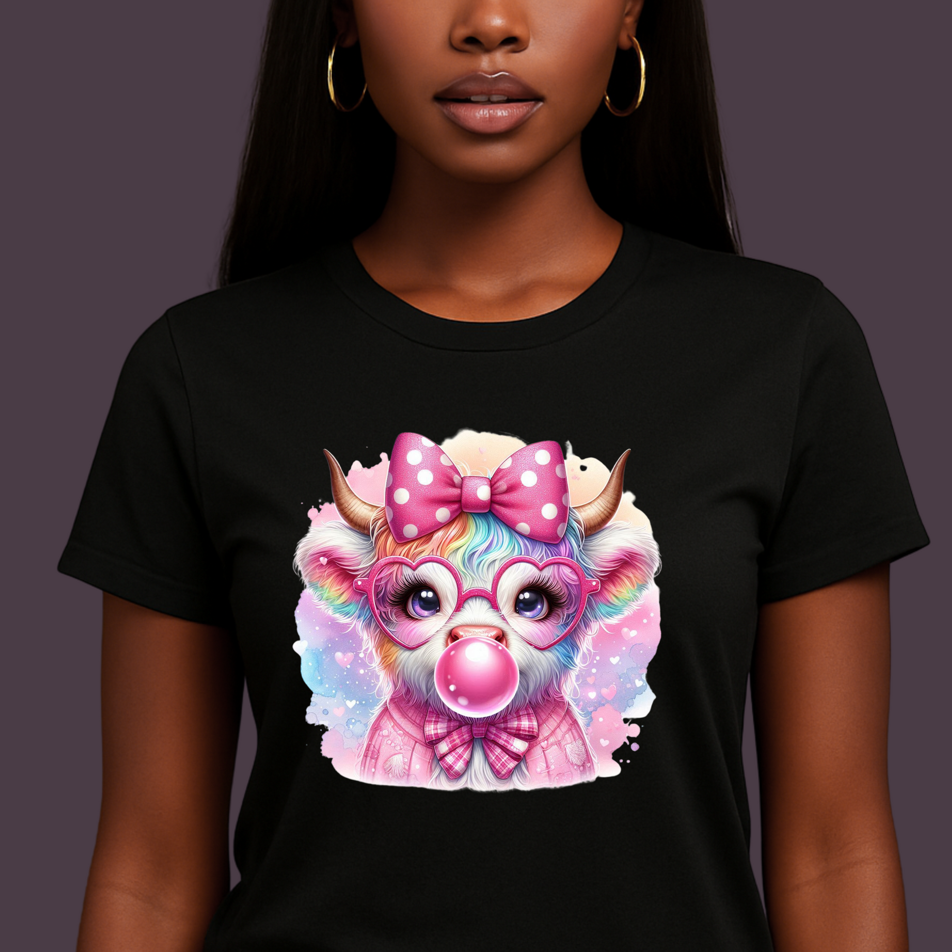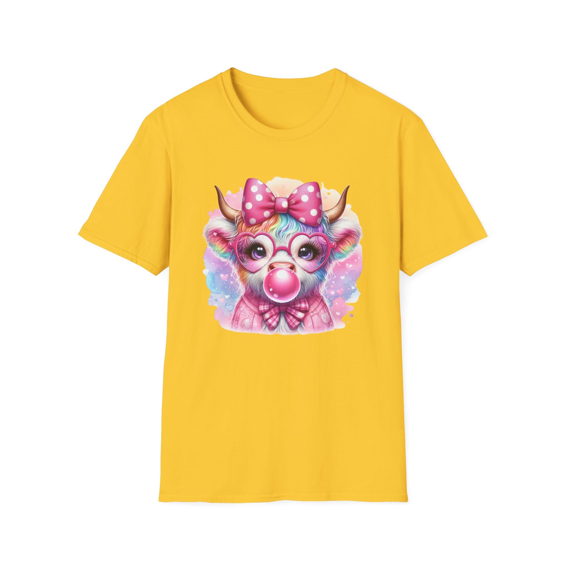 A whimsical and colorful Highland cow design on a soft and durable unisex T-Shirt, featuring pastel rainbow fur, large heart-shaped pink glasses, and a big polka dot bow on its head. The cow is blowing a sparkling pink bubble gum bubble, exuding a fun, attitude, and fairy-like cuteness. This T-Shirt is perfect for those who enjoy quirky and playful fashion, adding a touch of charm and whimsy to their wardrobe. Ideal for casual everyday wear, this tee is suitable for adults and can be worn year-round. It makes a great gift for animal lovers, quirky fashion enthusiasts, and those who appreciate unique and fantastical designs. Perfect for celebrating birthdays, holidays, or just injecting some fun into everyday life.