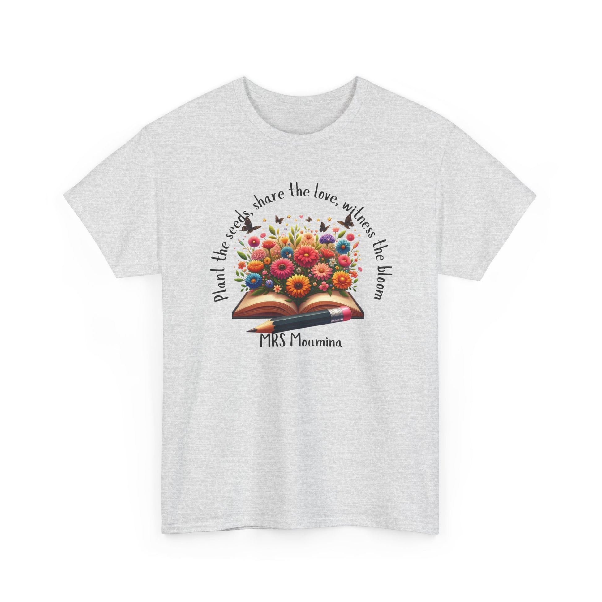 Colorful and cheerful T-Shirt with a playful and warm spring-themed digital illustration of an open book with blooming flowers, butterflies, and stars. Perfect for teachers and anyone seeking inspiration. Ideal as a gift. Relevant for Teacher Appreciation Week, birthdays, and holidays.
