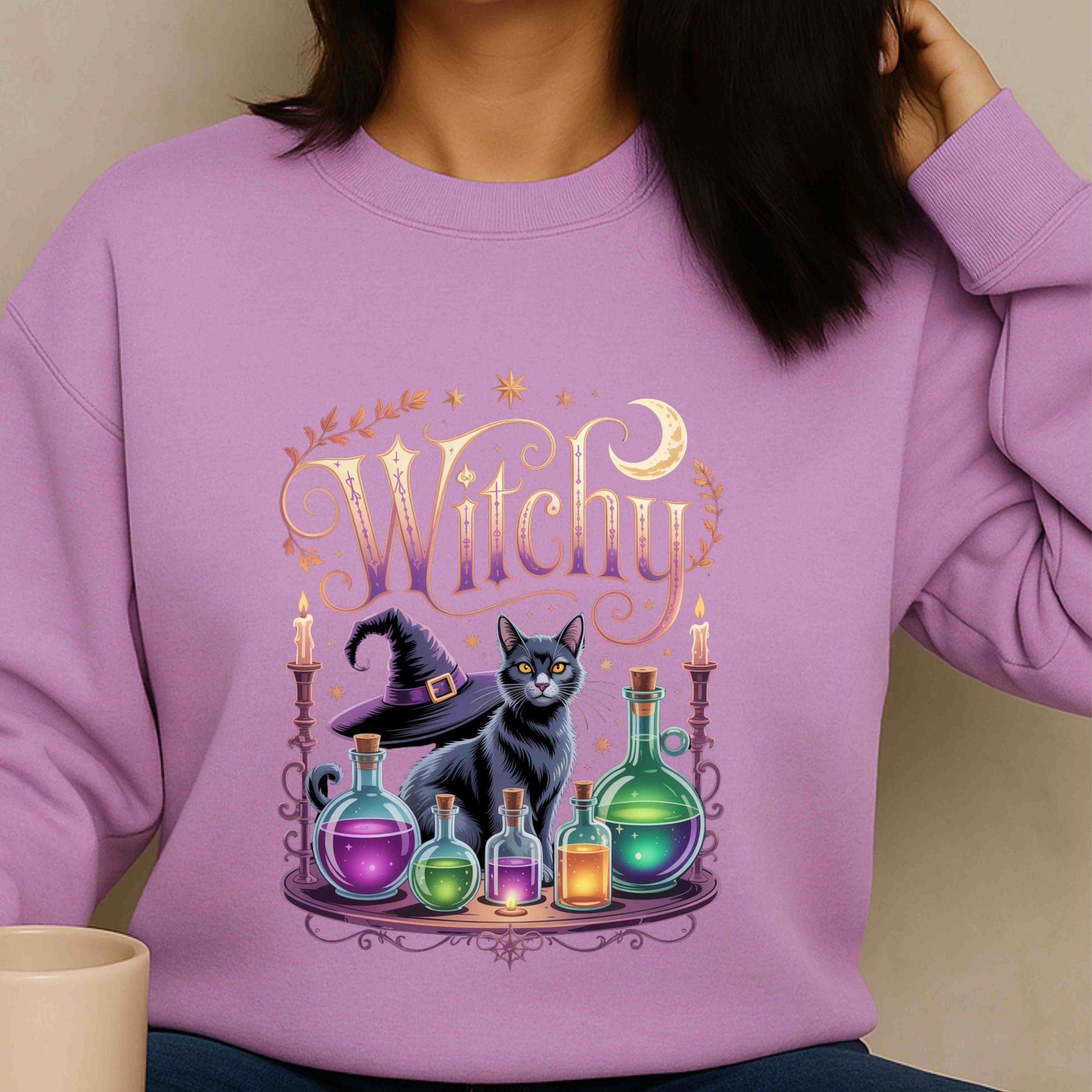 Witchy Cat Long Sleeve Tee, Halloween Shirt, Gift for Cat Lovers, Spooky Fashion, Cozy Unisex Top